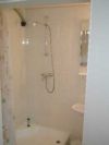 mit Acryleckwanne und WC, Waschtisch, Schrank und Ablageflächen